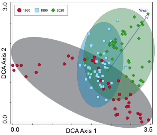 We conducted a detrended correspondence analysis (DCA) to explore differentiation patterns in plant species composition of plots between the subsequent surveys and to check the percentage of variation explained. For this purpose, species cover was transformed with Log (1 × X + 1) and rare species were down-weighted. The distribution of the sample groups on the DCA diagram was visualized and interpreted by the passive plotting of the Year supplementary variable. The DCA was conducted in CANOCO 5.12 software (Microcomputer Power: Ithaca, NY, USA) [].