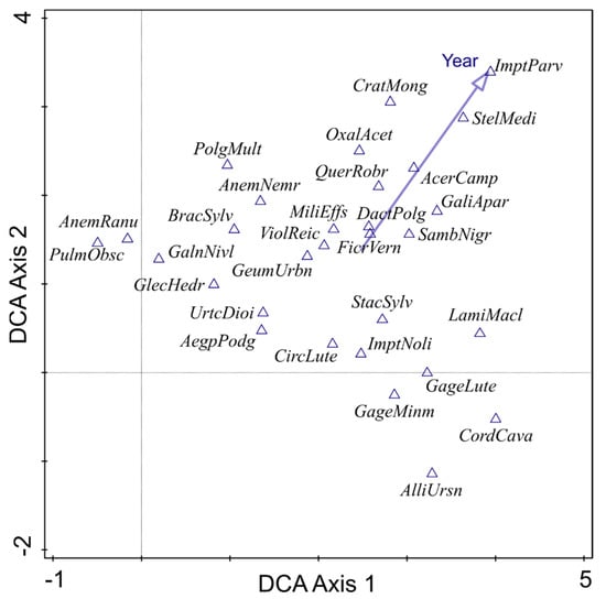 Results of the DCA summarized the variation of understory species composition of the protected, ancient riparian forests in the Odra Valley near Oława (Silesian Lowland, Southwestern Poland), surveyed in 1960, and resurveyed in 1990 and 2020, and with passive projection of the vector of Year as supplementary variable. Species with scores limit to 30 by fit according to total species composition. Explanation of the abbreviations used: AcerCamp—Acer campestre; AegpPodg—Aegopodium podagraria; AlliUrsn—Allium ursinum; AnemNemr—Anemone nemorosa; AnemRanu—Anemone ranunculoides; BracSylv—Brachypodium sylvaticum; CircLute—Circaea lutetiana; CordCava—Corydalis cava; CratMong—Crataegus monogyna; DactPolg—Dactylis polygama; FicrVern—Ficaria verna; GageLute—Gagea lutea; GageMinm—Gagea minima; GalnNivl—Galanthus nivalis; GaliApar—Galium aparine; GeumUrbn—Geum urbanum; GlecHedr—Glechoma hederacea; ImptNoli—Impatiens noli-tangere; ImptParv—Impatiens parviflora; LamiMacl—Lamium maculatum; MiliEffs—Milium effusum; OxalAcet—Oxalis acetosella; PolgMult—Polygonatum multiflorum; PulmObsc—Pulmonaria obscura; QuerRobr—Quercus robur; SambNigr—Sambucus nigra; StacSylv—Stachys sylvatica; StelMedi—Stellaria media; UrtcDioi—Urtica dioica; ViolReic—Viola reichenbachiana.