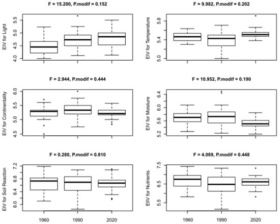 Summary box-and-whisker plots of mean Ellenberg’s Indicator Values (EIVs) for three subsequent surveys of the riparian forest in the Odra River Valley (SW Poland), produced by one-way permutational ANOVA. The central line of each box indicates the median value, box boundaries the lower (25%) and upper (75%) quartiles, and whiskers the range of values. F—test statistic; P. modif. was calculated using a modified permutation test of significance for analysis of mean EIVs [].