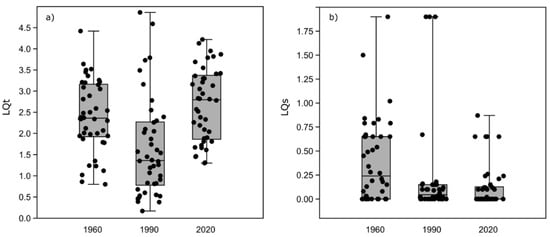We found no statistically significant changes in the litter quality index for trees (LQt) between 1960 and 2020 (p = 0.25), although there was a difference between the first and the last surveys and the middle one (in both cases p < 0.001, see Figure 6a). On the other hand, the litter quality index for shrubs (LQs) has gradually decreased (see Figure 6b), with statistically important differences between 1960 and 2020 (H = 11.4, p < 0.002).
