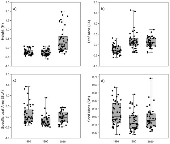 The results of the RDA also suggested that the CWMs of studied plant functional traits were not equally responsible for the observed changes in functional structure of individual patches. All plots investigated between 1960 and 1990 showed a high consistency of functional features. Only some of them were marked by a high level of CWMs for seed mass and height. However, in the most recent survey, several analyzed patches showed much higher values of SLA, and partially also of height, which has been already confirmed by the presented analysis of changes in functional traits over time (Figure 8). The first axis, that explained 17.4% of the variation, was correlated with changes in SLA over time. The second axis, explaining 38.38% of the variability, seemed to correlate with leaf area, height, and seed mass, accounting more for the internal variability of the investigated plots (Figure 8). In the first period of investigation plots were marked by the higher values of the CWMs for LA and SM, and during the second and third surveys the CWMs for H increased.