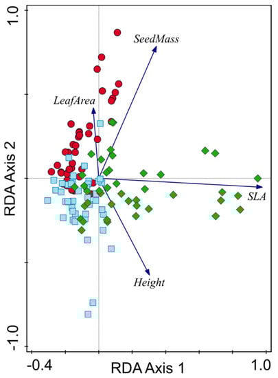 We obtained trait values from the LEDA database []. We used mean species values for traits and did not consider intraspecific trait variation [,], (see Supplementary Materials, Table S3). We excluded all woody species (tree, shrub) from the dataset in this part of the data analysis. Therefore, only herbaceous plants (listed in Supplementary Materials, Table S4) were assigned mean trait values. Trait attributes were analyzed for 92 out of the 97 species recorded in the herb layer, whereas the remaining five species, without full representativeness of trait attributes, were removed from the dataset [].