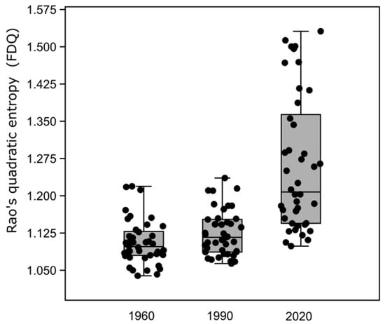 Functional diversity FDQ (measured as Rao’s quadratic entropy) of the investigated forests were stable from 1960 to 1990 (p = 0.35), and after 1990 it rapidly increased (Figure 9). There were significant differences between 1960 and 2020, as well as between 1990 and 2020 (p < 0.001).