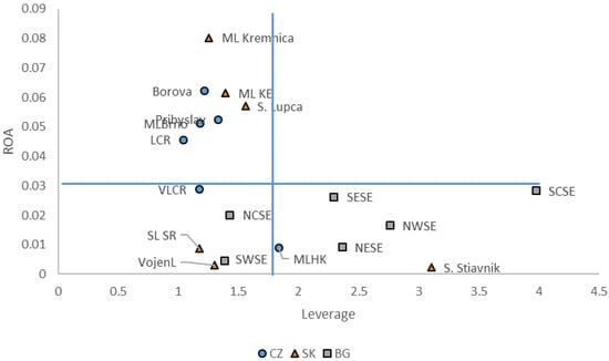 The vertical line in Figure 1 represents the average financial leverage, and the horizontal one represents the average ROA values. The figure divides the enterprises into four groups. The first one called Q-1 includes seven enterprises with low leverage and a high ROA; 57% of these enterprises are Czech and 42% Slovak, respectively. The second group, Q-2, includes enterprises with a low ROA and low leverage. Most of the Bulgarian enterprises are categorized under Q-3, with high leverage and a small ROA.