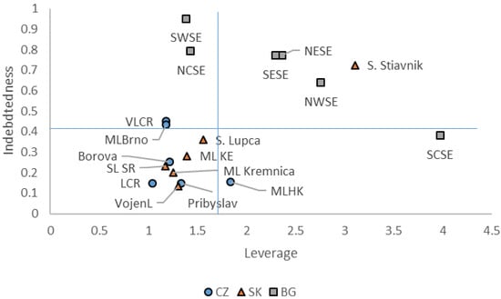 Figure 2 reveals an interesting division among the studied enterprises. Due to their close genesis, the Slovak and Czech companies are distributed similarly. In contrast, the Bulgarian enterprises are spread in almost all the quadrants. Four enterprises, i.e., two Bulgarian, one Slovak, and one Czech company, are categorized in Q-1, with below-average leverage and above-average indebtedness. Most of the Czech and Slovak enterprises are characterised by low leverage and low indebtedness (Q-2). The Bulgarian enterprises have high leverage and low indebtedness (Q-4). There is only one enterprise in Q-3 with high leverage and indebtedness below average. This is a typical situation for financial leverage and can be considered “the main group”. The exceptions present something specific to the particular enterprise. Panel data analysis (PDA) revealed the specific features that determine whether the enterprise is out of the “main group”.