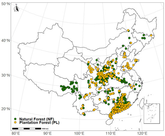 Root, litter and soil samples were collected in China during the years 2011–2015. Samplings and laboratory analyses were all conducted following a consistent standardized protocol [20,21]. We divided the country into three grid sizes (100, 400 and 900 km2) based on vegetation distribution using a 1: 1,000,000 vegetation map. A grid size of 100 km2 was designed for tropical and subtropical regions with rich species diversity, and 400 and 900 km2 were for temperate and alpine vegetation regions where species diversity is relatively poor. Then we overlaid the grid maps with administrative maps and randomly select 3% to 5% of the grid for the field surveys by considering forest origin, age and type [22]. At each site, a 1000-m2 plot was established (600 m2 in some cases in plantations), each of which consisted of 10 subplots (10 m × 10 m) for the field survey. In each plot, plant roots were collected from the commonest tree species (diameter breast height ≥ 5 cm, 1–5 species). We also set up three 1 m × 1 m quadrats in each subplot for litter sampling. After removing the litter layer, soil samples at 0–50 cm were collected in each plot with a soil auger. Fertilized sites, sites with missing measurements in any depth of 0–50 cm in the soil matrix, and missing root of tree samples were filtered, and in total of 1112 sites were retained for analysis (Figure 1). All the root and litter samples were oven-dried at 65 °C to a constant weight and ground into fine powder with a plant sample grinder. Soil samples were air dried. C and N concentrations in the root, litter and soil were analyzed using an elemental analyzer (2400 II CHNS; Perkin-Elmer, Boston, MA, USA). P concentrations were determined using the molybdate/ascorbic acid method after H2SO4-H2O2 digestion. The sampled sites were divided into two groups, natural (NF) and plantations (PL) forests. Three successional stages or growth stages were identified for each (early, middle and late stages). Details of the identification of the successional and growth stages can be found in Yu et al. [22]. Dominant species of different successional stages in different forest origins were shown in detail in Table A1.