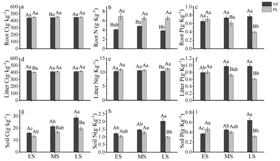 C, N and P concentrations in roots (a–c), litter (d–f) and soil (g–i) in different succession stages in NF and PL. Note: The error bars indicate standard errors of the means. Capital letters indicate significant differences in concentrations in different forest origins at the same succession stage (p < 0.05), while lowercase letters indicate significant differences in concentrations in the same forest origin at different succession stages (p < 0.05); n = 149, 344, 174, 102, 199 and 144 for NF−ES, NF−MS, NF−LS, PL−ES, PL−MS and PL−LS, respectively.