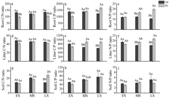 C, N and P stoichiometry in roots (a–c), litter (d–f) and soil (g–i) in different succession stages in NF and PL. Note: The error bars indicate standard errors of the means. Capital letters indicate significant differences in concentrations in different forest origins in the same succession stage (p < 0.05), while lowercase letters indicate significant differences in concentrations in the same forest origin at different succession stages (p < 0.05); n = 149, 344, 174, 102, 199 and 144 for NF−ES, NF−MS, NF−LS, PL−ES, PL−MS and PL−LS, respectively.