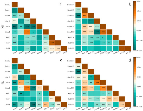 Pearson’s correlation matrix between plant root, litter and soil C, N and P concentrations and stoichiometric ratios in NF and PL. (a,b) The correlation between the concentrations of C, N and P and the stoichiometric ratios of C:N, C:P and N:P in roots, litter and soil in NF; (c,d) the correlation between the concentrations of C, N and P and the stoichiometric ratios of C:N, C:P and N:P in roots, litter and soil in PL. * p < 0.05, ** p < 0.01,*** p < 0.001.