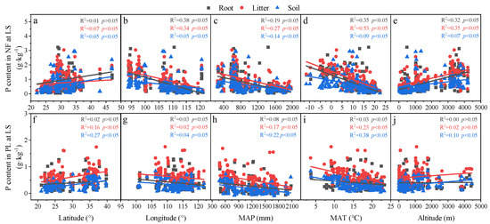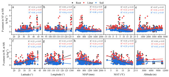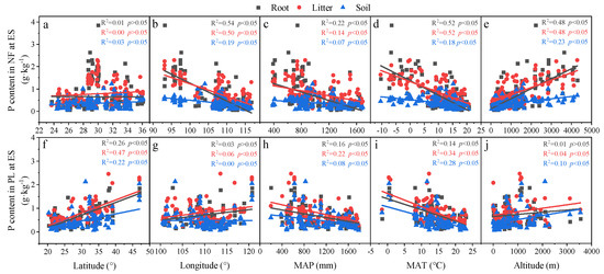 C concentrations in roots, litter and soil do not significantly change with latitude, longitude, MAP, MAT or altitude in different succession stages in PL (Figure A1, Figure A2 and Figure A3). However, in NF, litter C concentrations were positively correlated with altitude in the ES, but were significantly negatively correlated with altitude in the MS (p < 0.05) and did not change with altitude in the LS (Figure A1, Figure A2 and Figure A3). Root and litter N concentrations were significantly positively correlated with longitude, while soil N concentrations were negatively correlated with longitude over all three succession stages (p < 0.05) (Figure A4, Figure A5 and Figure A6). MAP, MAT and altitude had completely different effects on the N concentrations in roots, litter and soil in NF and PL. Overall, MAP and MAT had positive influences on root and litter N concentrations and a negative influence on the soil N concentrations in NF in all three succession stages. By contrast, MAP was inversely correlated with root and litter N concentrations and positively correlated with soil N concentrations in PL across the three successional stages (Figure A4, Figure A5 and Figure A6). MAP and MAT were significantly negatively correlated with P concentrations in roots, litter and soil in both NF and PL, while latitude had positive correlations with P concentrations in litter and soil in both NF and PL (except for litter in the ES in NF) (Figure 5, Figure 6 and Figure 7). The P concentrations of the roots were only significantly positively correlated with latitude in the MS in NF, and in both the ES and MS in PL. Furthermore, the P concentrations of the roots, litter and soil decreased markedly with longitude in both the ES and LS in NF (Figure 5 and Figure 7) (p < 0.05) but did not change with longitude in the MS (Figure 6). They increased with longitude in both the ES and MS (Figure 5 and Figure 6) (p < 0.05) but did not change with longitude in the LS in PL (Figure 7).