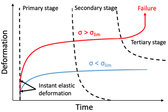 Creep deformation of timber under load. σ = applied load stress, σlim = ultimate stress limit [19].
