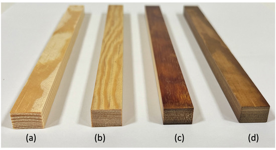 Specimens in the four groups: (a) reference without any treatment, (b) densified, (c) resin-impregnated and densified, and (d) densified and thereafter thermally modified.