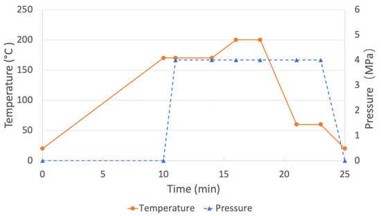 An open-system hydraulic hot-press (Langzauner “Perfect” LZT-UK-30-L, Lambrechten, Austria) equipped with a water-cooling system was used for the THM densification of groups D, RI-D and D-TM. The specimens were compressed in the radial direction from 20 to 10 mm in thickness (50% target compression ratio). A metal stop with a height of 10 mm determined the endpoint. The THM densification included the following stages: (a) the upper and lower platens of the hot press were pre-heated to ≈170 °C, (b) the specimens were placed in the press, and a pressure of 4 MPa was applied in the radial direction with a closing speed of 3 mm s−1, (c) the pressing conditions were held for 3 min after the press platen reached the metal stop, (d) the temperature of the upper and lower platens was raised to ≈200 °C and kept at this temperature for 2 min, and (e) the upper and lower platens were cooled to ≈60 °C with the specimens remaining under compression. The press was then opened, and the specimen dimensions were measured immediately (Figure 3).