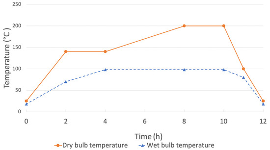 The thermal modification was carried out for group D-TM in a non-pressurized chamber, heated with a 4 kW electric resistance and a 1.4 bar steam generator following the schedule shown in Figure 4. The process was divided into three stages: (a) the temperature was progressively raised from room temperature (≈20 °C) to ≈200 °C (dry-bulb temperature) for 8 h, (b) the temperature was held at 200 °C for 2 h (thermal-modification stage), and (c) the chamber was cooled down to a temperature of ≈100 °C, and the specimens were removed after the chamber had reached room temperature.