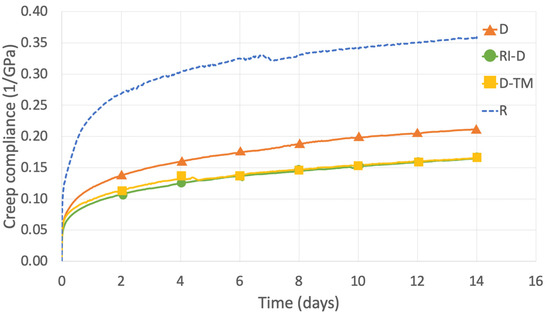 Average creep compliance of untreated and treated wood for 14 days. R is the reference group without any treatment; D is the densified group; RI-D is the resin-impregnated and densified group; D-TM is the densified and thereafter thermally modified group.