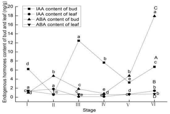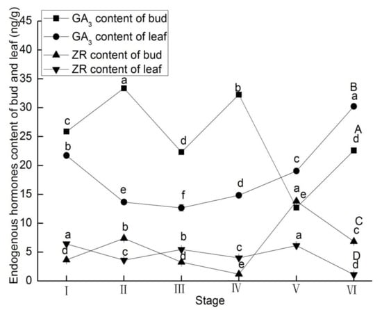 In the buds, the values of ABA/IAA, ABA/GA3, and ZR/IAA, ZR/GA3 had a similar change tendency from stage I to IV, and significantly increased from stage I to II then decreased from stage II to IV (Figure 4). From stage V to VI, the values of ABA/IAA and ABA/GA3 significantly increased, while the values of ZR/IAA and ZR/GA3 significantly decreased at this stage.