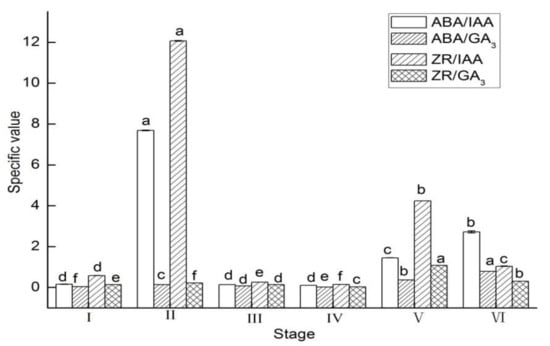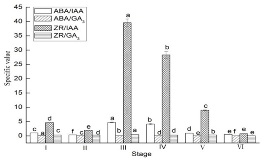In the leaves, the values of ABA/IAA, ABA/GA3, ZR/IAA, and ZR/GA3 significantly decreased from stage I to II, and then increased from stage II to III (Figure 5). However, the values of ABA/IAA, ABA/GA3, ZR/IAA, and ZR/GA3 significantly decreased from stage III to VI.