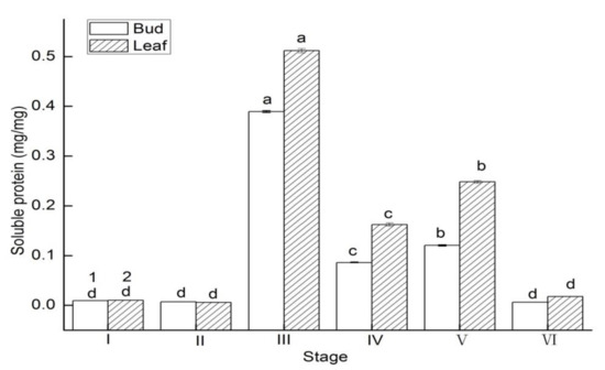 Soluble protein contents in the buds and leaves had a similar change tendency. Soluble protein contents in the buds increased 39.28-fold from stage I to III, and decreased by 98.38% from stage III to VI (Figure 6). Soluble protein contents in the leaves increased 48.66-fold from stage Ito III, and decreased by 96.56-fold from stage III to VI.