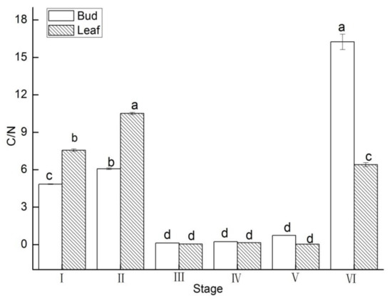 C/N values decreased by 26% and increased 20.75% from stage I to II and between stages V to VI, respectively, in buds (Figure 7). C/N values increased by 39% and 143.34% from stage I to II and between stages V to VI, respectively, in leaves.