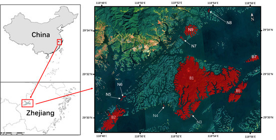 The study was conducted at the Thousand Island Lake (TIL) in Zhejiang Province, eastern China (Figure 1). The TIL is a hydroelectric reservoir, which was formed by the construction of the Xin’an River Dam in 1959 [38]. The lake has a total area of 581 km2 and has 1078 land-bridge islands (>0.25 ha), and a designed highest water level of 108 m above the sea level. All islands were isolated at the same time, beginning with the damming of the Xin’an River and subsequent flooding of the landscape [23]. Forests were completely clear-cut during the construction of the reservoir dam, and contemporary forests on the islands are of similar succession age (i.e., about 60 years) [39]. The major vegetation type is a secondary successional forest dominated by Masson pine (Pinus massoniana) with broad-leaved plants (e.g., Loropetalum chinense) in the sub-canopy and understory [40]. The study area is characterized by a subtropical monsoon climate. The mean annual temperature in the TIL region is 17.0 °C, with a frost-free season of 241–296 days, and daily temperatures ranging from −7.6 °C in January to 41.8 °C in July. The annual precipitation varies from 1148 to 2015 mm, with 155 days of precipitation per year, mostly between April and June [40].