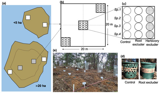The experiment was conducted on small islands (<5 ha) and large islands (>20 ha) in the TIL (a). The experiment contained two edge plots (<40 m to island edge) on all islands and an additional two interior plots (>40 m) on large islands (a). Each plot contained three subplots (b) with 12 flowerpots that manipulated belowground competition (dotted line signifies perforated flowerpots to permit other plant roots to grow in; solid line signifies root-excluding flowerpots to prevent root competition) and aboveground herbivory (including seed predation) (circle mesh signifies a fence over the flowerpots to exclude seed predation and seedling herbivory) for four species (c). Root-excluding flowerpots were 21 cm high × 23 cm wide, and all flowerpots were open on the bottom (d). A photograph of a subplot in the experiment appears in (e).
