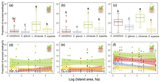 The proportion of surviving seedlings differed significantly among the four species, with L. chinense, a dominant species on the islands, having the highest proportion of surviving seedlings under all three treatments (Figure 3). C. camphora and S. superba had higher proportions of surviving seedlings than C. glauca under the control and excluding root competition treatments (Figure 3a,b), while C. camphora had a higher proportion of surviving seedlings than C. glauca and S. superba (Figure 3c). Meanwhile, there was no linear relationship between germination rates of the four species and island area in the control (Figure 3d), excluding root competition (Figure 3e), or excluding herbivory (Figure 3f) treatments, indicating that island size did not affect differences between species.