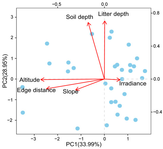 The first two axes of the PCA explained c. 62% of the variation in environmental variables (Figure 4): the first PC axis (PC1) explained 33.99% of the variance and was positively correlated with irradiance and negatively correlated with altitude, edge distance, and slope. Because PC1 was associated with environmental changes along the edge gradient, we refer to PC1 as the “edge effect” axis. The second PC axis (PC2) explained 28.95% of the variance and was positively related to soil depth and litter depth. Because these variables indicate soil resources, we refer to PC2 as the “soil resource” axis.