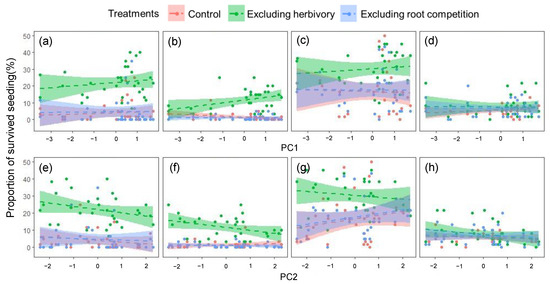 There was a significant positive effect of excluding herbivory on the proportion of surviving seedlings after controlling for PC1 for C. camphora (F3, 92 = 35.19, p < 0.001), C. glauca (F3, 92 = 46.46, p < 0.001), and L. chinense (F3, 92 = 9.218, p < 0.001) (Table 2), and after controlling for PC2 (Table A1). Compared to the control and excluding root competition treatments, the excluding herbivory treatment led to significantly more seedling survival (Table 2, Figure 5), and there was no significant relationship between the proportion of surviving seedlings and PC1 or PC2 (Figure 5).