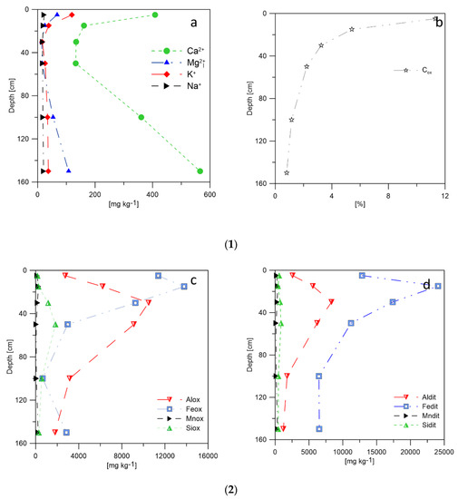Vertical distribution in the soil profile of the soil chemical properties analysed in our study area. (a,b) were soil properties of external sources, and (c,d) were soil properties of pedogenic sources. (1). Soil chemical properties of external sources. (2). Soil chemical properties of pedogenic sources. Cations: Ca2+-Calcium, Mg2+-Magnesium, K+-Potassium, Na+-Sodium, Alox, Feox, Mnox, Siox-Aluminium, Iron, Manganese and Silicon oxides, C-Carbon, Aldit, Fedit, Mndit, Sidit- Aluminium, Iron, Manganese and Silicon dithionite.