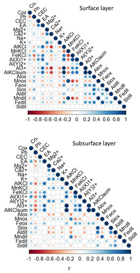 Pearson correlation coefficients for relationships between soil chemical properties for the surface and subsurface layers. Positive correlations are displayed in blue and negative correlations in red. The colour intensity and the size of the circle are proportional to the correlation coefficients. Below and to the side of the correlogram, the legend colour shows the correlation coefficients and the corresponding colours. Correlations with p-value > 0.05 are considered insignificant, and the correlation coefficient values are left blank. Abbreviations: organic carbon (Cox), soil reaction (pH), exchangeable base cations of magnesium, calcium, sodium, and potassium (Mg2+, Ca2+, Na+, K+), aluminium cations: Al (X)1+, Al (Y)2+, Al3+, exchangeable acidity (EA), cation exchange capacity (CEC), exchangeable aluminium, manganese and iron (AlKCl, MnKCl, FeKCl), aluminium, manganese, iron and silicon oxides (Alox, Mnox, Feox, Siox) and Iron, Manganese and Silicon dithionite (Aldit, Mndit, Fedit, Sidit).