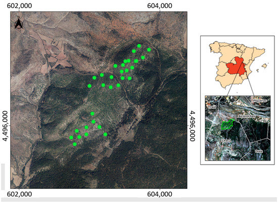 Study area and location of field plots to estimate shrub biomass in the burnt area (Chequilla, Spain). 2020.