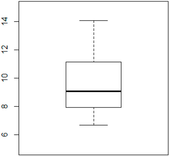 For the shrub biomass sampling, the mean (9.488 Mg·ha−1) was slightly higher than the median value (9.06 Mg·ha−1). The difference between the median and the third quartile (11.127 Mg·ha−1) was higher than that between the median and the first quartile (7.947 Mg·ha−1). As a result, the database displayed a slightly positive skewed distribution but was close to a normal one. The range of 6.7 to 14.040 Mg·ha−1 was not especially wide for a shrub structure of the same age. In addition, remarkable differences could not be found via a visual inspection. However, even with a minor asymmetry in the distribution of the biomass, these values and ranges were also reported by other authors [12]; consequently, the sampling could be accepted as adequate for this study.