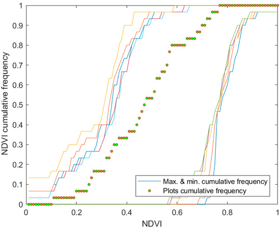 This method provided a total population of N = 199 + 1 (actual) cumulative frequency on which a statistical test with a significance level of 0.05 was applied: for a given NDVI level, if the actual plot density function is located between two limits defined by the five highest and five lowest values of the 200 cumulative frequencies, the null hypothesis is not rejected because there are no differences between both samples; otherwise, it is rejected. In the first case, both NDVI distributions are supposed to be equivalent, assuming those NDVI distributions between the area of study and the sampling plots.
