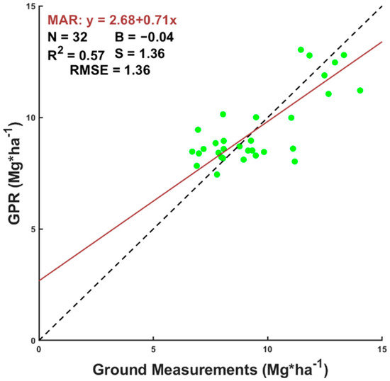Measured vs. estimated (GPR) biomass values for Sentinel-2. MAR.: major axis regression fit; N: number of samples; B: mean bias; R2: coefficient of determination; S: standard deviation of the bias; RMSE: root-mean=square error. The dashed line corresponds to the 1:1 line, while the continuous line is the MAR fit. Green points are shrub plots.