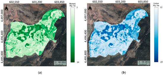 Actual shrub biomass and carbon stock 8 years after a fire burning a forest of Pinus sylvestris L. in Chequilla, Spain: (a) biomass of a regenerated shrub structure of Quercus pyrenaica Willd. (Mg·ha−1), 2020; (b) carbon stock of a regenerated shrub structure of Quercus pyrenaica Willd. (Mg C·ha−1), 2020.