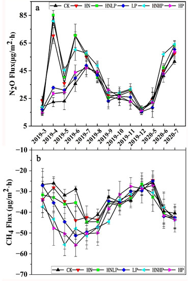 | Treatments | N2O (μg/m2·h) | CH4 (μg/m2·h) | N2O (μg/m2·h) | CH4 (μg/m2·h) |