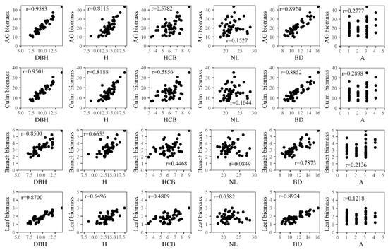 Relationship between total aboveground (AG) biomass and each component (culm, branch, and leaf) of six bamboo variables, including diameter at breast height (DBH), bamboo height (H), height to crown base (HCB), node length at DBH (NL), base diameter (BD), and bamboo age (A); r is the correlation between predictive variables and biomass of different components; the p value between each variable is less than 0.001.
