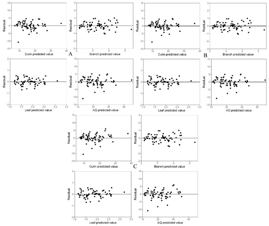 Based on the leave-one-out cross-validation method, the residual diagram of aboveground and component biomass drawn with the predicted value of the three predictors by using NEIVM one-step method. (A) Represents the residual diagram of the three predictors using the NEIVM one-step method, and (B,C) represent the residual diagrams of eliminating heteroscedasticity through and as weight functions, respectively.