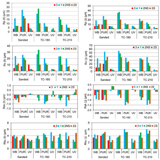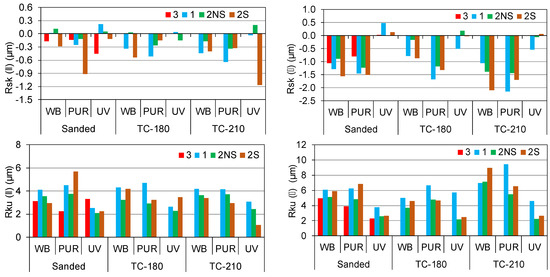 The lowest values of the roughness parameters Ra(ǁ), Rq(ǁ), Rz(ǁ), Rp(ǁ), Rv(ǁ), and Rsk(ǁ) were fixed for the surfaces varnished with two varnish layers with intermediate sanding (2S), and with three varnish layers (2.42 µm and 2.64 µm, 3.15 µm and 3.18 µm, 15.40 µm and 13.01 µm, 6.04 µm and 6.20 µm, 9.34 µm and 6.81 µm, and −0.43 µm and −0.25 µm, respectively) (Figure 2); in addition, the differences between these values were insignificant. The largest values of the roughness parameters Ra(ǁ), Rq(ǁ), Rz(ǁ), Rp(ǁ), Rv(ǁ), and Rsk(ǁ) were measured for the surfaces varnished with two varnish layers without intermediate sanding (2NS), and with one varnish layer (3.07 µm and 3.66 µm, 3.92 µm and 4.82 µm, 18.22 µm and 23.35 µm, 8.51 µm and 10.09 µm, 9.70 µm and 13.26 µm, and −0.07 µm and −0.22 µm, respectively); in addition, the difference between these values was insignificant (except for Rv(ǁ)). The varnished surfaces with three, one, 2NS, and 2S varnished layers differed insignificantly for the parameter Rku(ǁ).