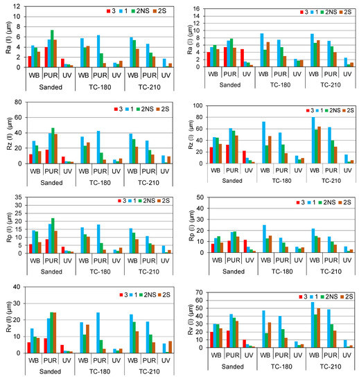 The lowest values of the roughness parameters Ra(ꓕ), Rq(ꓕ), Rz(ꓕ), Rp(ꓕ), Rv(ꓕ), and Rku(ꓕ) were recorded for the UV-varnished surface (1.88 µm, 2.33 µm, 10.10 µm, 4.64 µm, 5.46 µm, and 3.45 µm, respectively), while the lowest Rsk(ꓕ) = −1.52 µm for the PUR-varnished surface (Figure 2). The highest values of the roughness parameters Ra(ꓕ), Rq(ꓕ), Rz(ꓕ), Rp(ꓕ), and Rv(ꓕ) were fixed for the WB-varnished surface (6.88 µm, 10.28 µm, 54.85 µm, and 16.34 µm and 38.12 µm, respectively). The highest values of the roughness parameters Rsk(ꓕ) and Rku(ꓕ) were observed for the UV-varnished (Rsk(ꓕ) = −0.10 µm) and PUR-varnished (Rku(ꓕ) = 6.30 µm) surfaces, respectively. The values of the parameters Ra(ꓕ), Rq(ꓕ), Rz(ꓕ), Rp(ꓕ), and Rv(ꓕ) for the UV-varnished surface were 3.2 and 3.6, 3.5 and 4.4, 4.5 and 5.4, 2.7, and 3.5, and 6.1 and 7.0 times lower than the values of these parameters for the PUR-varnished and WB-varnished surfaces, respectively. The values of Rsk(ꓕ) for the PUR-varnished surface were 1.4 and 15.1 times smaller than for the WB-varnished and UV-varnished surfaces, respectively. The values of Rku(ꓕ) for the UV-varnished surface were 1.7 and 1.8 times smaller than for the WB-varnished and PUR-varnished surfaces, respectively.