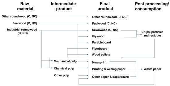 The current version of the FOROM represents the global wood product market in terms of 20 distinct interconnected products (Figure 1; Appendix A, Table A1) across 55 countries and regions of the world (Appendix A, Table A2), although additional regions and products may be included (see [34]). The model tracks the complex relationships between wood products, which is of particular importance to certain product categories, such as wood pellets, which may receive feedstock from various sources including coniferous and non-coniferous industrial roundwood, fuelwood, or chips, particles, and residuals from sawmilling activities.