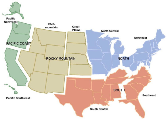 Past and present wood pellets markets have been thoroughly examined, including analysis on the wood pellet market supply chain [5,6], wood pellet market integration [7,8], life cycle emissions and carbon neutrality [9,10,11], and costs [12]. A few studies dealt with the physical and combustion characteristics of wood pellets’ raw materials [13,14]. Given that forest by-products and small-diameter trees are the major sources of raw material for wood pellets, understanding the interactions between wood bioenergy and forest product markets has vital implications for forest industry development [8,15,16,17,18,19] and forest management [20]. Using the Global Forest Trade Model, Jonsson and Rinaldi [17] found that an increased wood pellet demand in the EU drove up forest biomass feedstock prices and led to lower production and consumption of wood-based panels and pulp. Nepal et al. [18] projected that competition for wood inputs would negatively impact the wood-based panel and pulp and paper sector in the U.S. but have positive effects on softwood lumber by reducing the effective net cost of lumber production through higher-value sales of mill residues. However, the wood energy sector was highly aggregated in their study. Parajuli [19], examining available evidence on markets in the U.S. Southeast, found that the wood pellet industry had driven pine pulpwood prices up in the study region, but the study did not account for the interactions between U.S. regional markets and global timber markets. Increasing wood energy demand not only puts pressure on the forest pulp-based industry but also raises concerns about food security [21] and forest ecosystem services [22]. Recent research has also addressed the potential impacts of wood pellet expansion on land-use change and its implications for net carbon balance [23,24,25], generally finding that an expanded market for wood energy, including pellets, could affect forestland area and hence net carbon uptake.