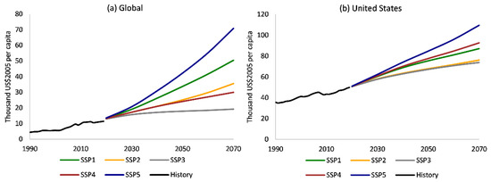 Historic and projected GDP per capita for IPCC Shared Socioeconomic Pathways: (a) global, (b) United States (source: [39]).