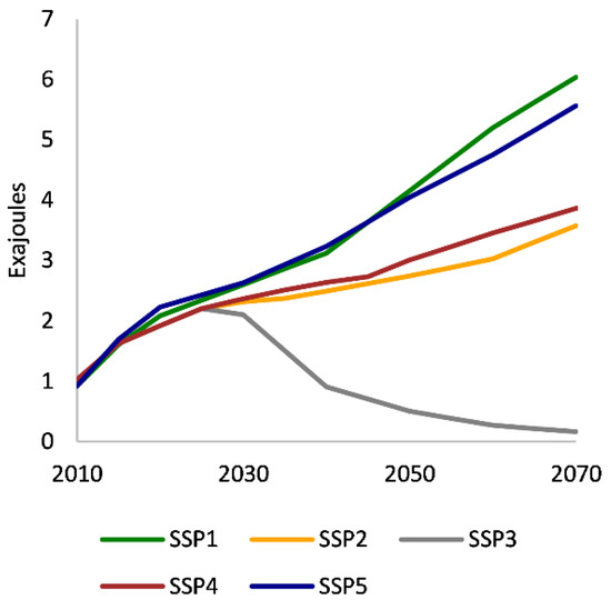 Global secondary energy production for IPCC Shared Socioeconomic Pathways (source: [35]).