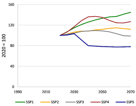 - O’Neill, B.C.; Kriegler, E.; Riahi, K.; Ebi, K.L.; Hallegatte, S.; Carter, T.R.; Mathur, R.; van Vuuren, D.P. A new scenario framework for climate change research: The concept of shared socioeconomic pathways. Clim. Chang. 2014, 122, 387–400. [Google Scholar] [CrossRef] [Green Version]