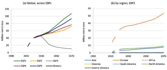 Global consumption of wood pellets (a) across SSPs and (b) by region within SSP2, 2012 to 2015 historic, 2020 to 2070 projections from FOROM.