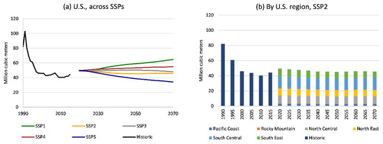 United States production of fuelwood (a) across SSPs and (b) by region within SSP2, 1990 to 2015 historic, 2020 to 2070 projections from FOROM.