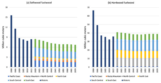 United States production of fuelwood by (a) softwood and (b) hardwood species groups, within SSP2, 1990 to 2015 historic, 2020 to 2070 projections from FOROM.