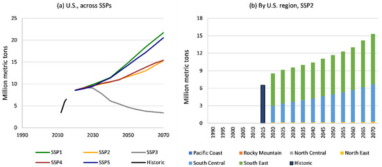 United States production of wood pellets (a) across SSPs and (b) by region within SSP2, 2012 to 2015 historic, 2020 to 2070 projections from FOROM.