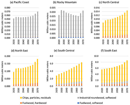 United States wood pellet feedstock by region and type, SSP2, projections from FOROM: (a) Pacific Coast, (b) Rocky Mountain, (c) North Central, (d) North East, (e) South Central, (f) South East.